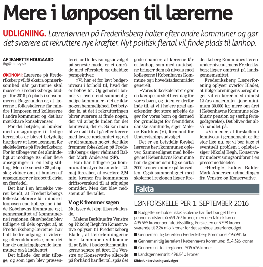 Poltikkerene på Frederiksberg er ved at få øjnene op for, at Frederiksberglærernes lønefterslæb skaber problemer med rekruttering og fastholdelse af lærere til kommunens skoler. Det kan man læse i denne uges udgave af Frederiksberg Bladet. Se artiklen her.